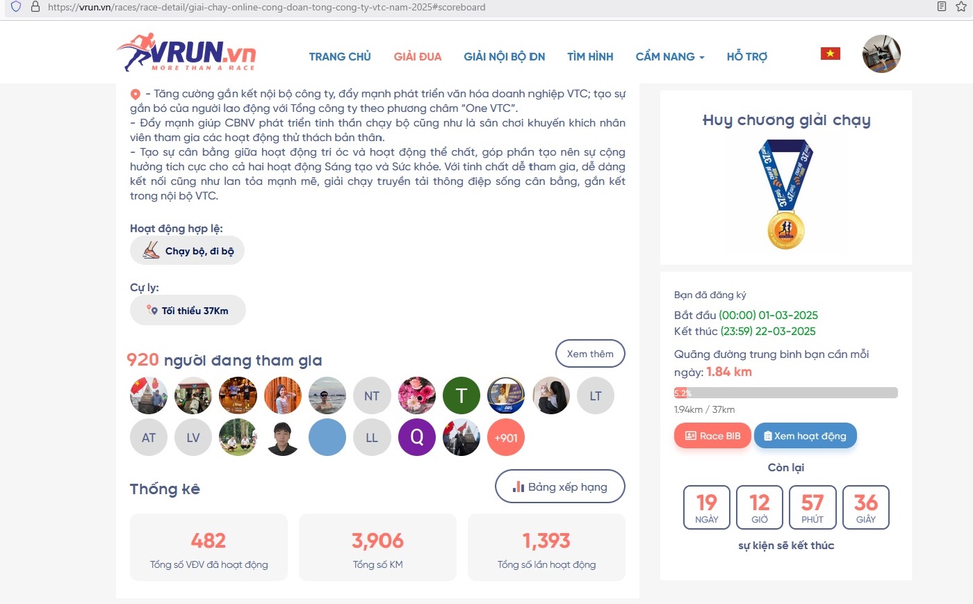 Đặc biệt, theo ghi nhận trên hệ thống Vrun, đã có 2 VĐV VTC hoàn thành 37km ngay trong ngày đầu khai giải. Xin chúc mừng hai VĐV xuất sắc Nguyễn Văn Kiên đến từ Liên Quân VTC Digital - VTC Online và VĐV Trương Đình Đồng của đội Cơ quan TCT với ghi nhận thời gian về đích lần lượt vào lúc 08:19:30 ngày 01/03/2025 và 08:26:27 ngày 01/03/2025.