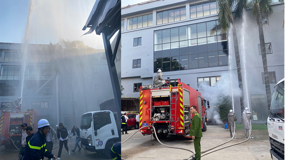 Trong chương trình, kịch bản giả định một đám cháy phát sinh tại khu vực tầng 2 của tòa nhà. Ngay lập tức, chuông báo cháy được kích hoạt, đội PCCC cơ sở triển khai các bước xử lý ban đầu, sử dụng bình chữa cháy mini để khống chế cháy lan.