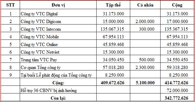 Từ nguồn đóng góp này, Công đoàn Tổng công ty đã trích một phần để gửi tới những đoàn viên, người lao động chịu ảnh hưởng bởi bão lũ nhằm động viên, thể hiện tình cảm, sự sẻ chia của tập thể VTC trong lúc hoạn nạn. Phần còn lại sẽ được nộp về Công đoàn Khoa học và Công nghệ Việt Nam theo kế hoạch, để tiếp tục hỗ trợ đồng bào các địa phương chịu thiệt hại.