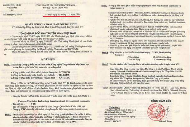 Cũng từ đây, tên giao dịch quốc tế “Vietnam Television Technology Investment and Development Company” – viết tắt VTC – được chính thức sử dụng, mở ra một thời kỳ phát triển mạnh mẽ trong lĩnh vực truyền hình, công nghệ và nội dung số.