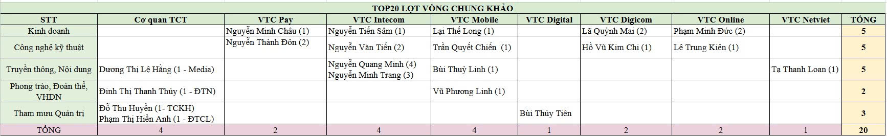 Danh sách 20 Gương mặt trẻ VTC Tiêu biểu năm 2025 lựa chọn từ 40 hồ sơ đề cử của các đơn vị trong toàn Tổng Công ty, thuộc 5 lĩnh vực bình chọn.