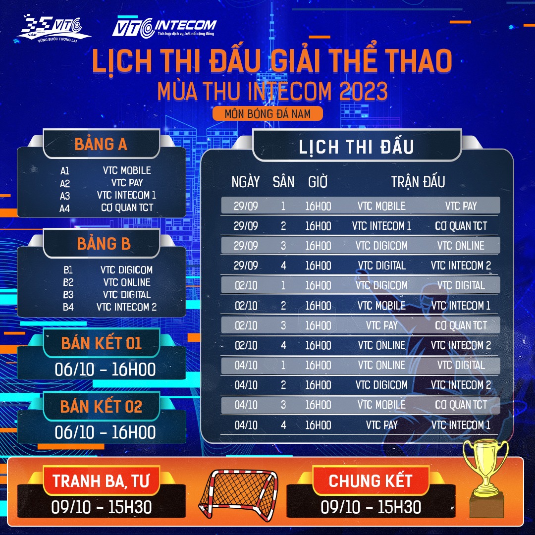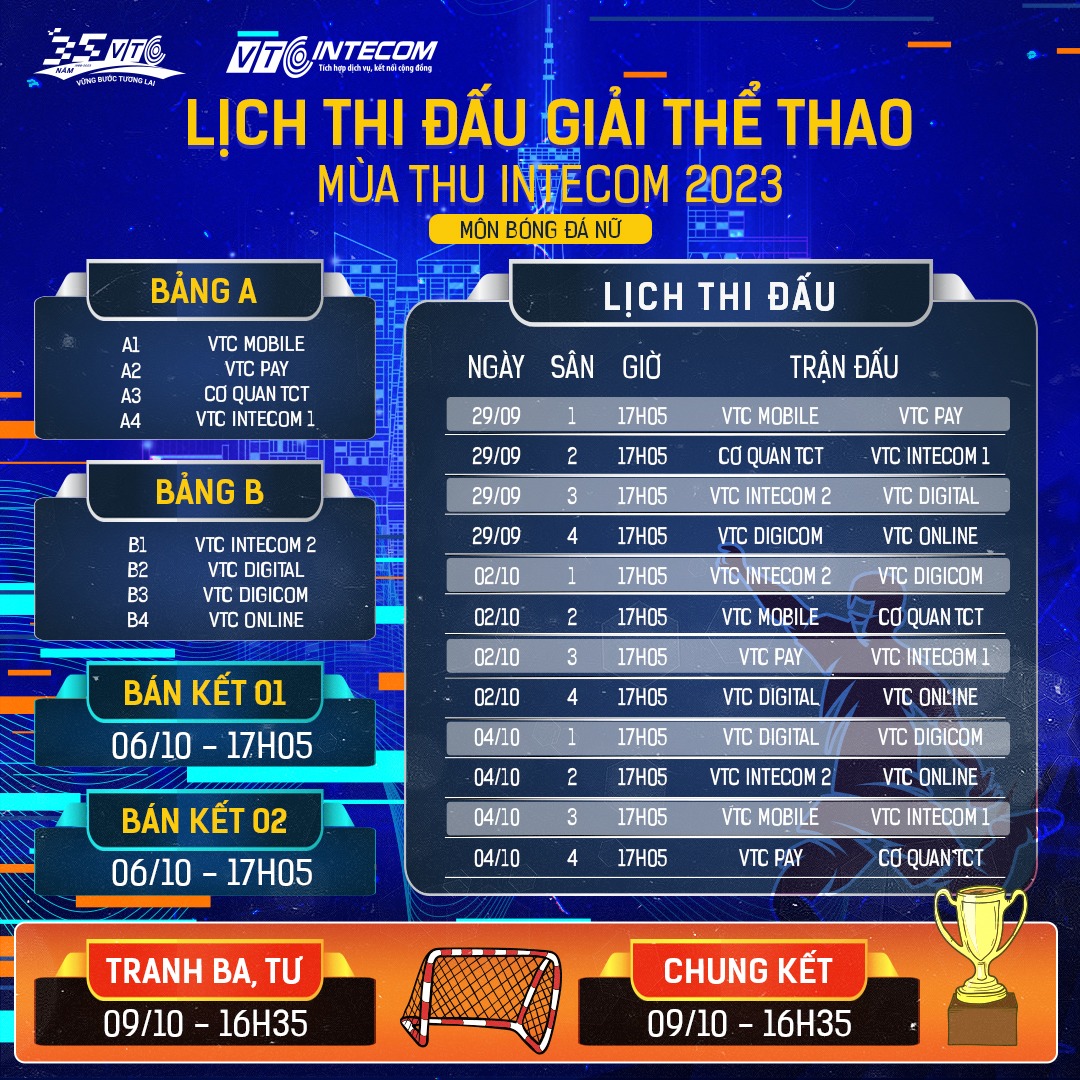 Do thời tiết diễn biến xấu trong mấy ngày qua, Lễ khai mạc và ngày khởi tranh giải Thể thao Mùa thu VTC Intecom 2023 đã được thay đổi để đảm bảo an toàn và sức khoẻ cho các VĐV. Dưới đây là những cập nhật lịch thi đấu mới nhất của bộ môn bóng đá Nam và Nữ trong khuôn khổ của giải đấu.