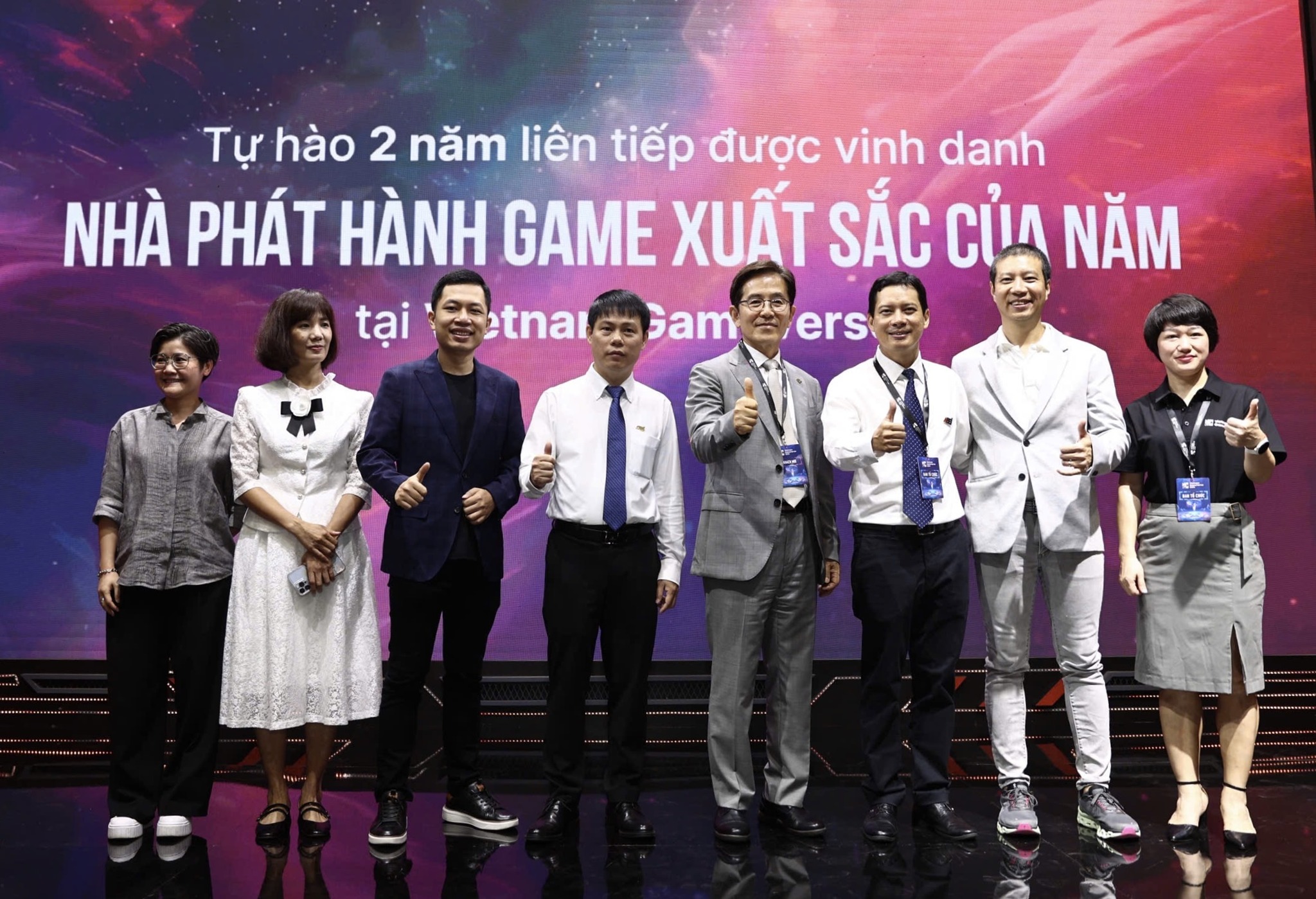 Tổng giám đốc Nguyễn Ngọc Bảo cùng các đại biểu chụp ảnh tại gian hàng của NPH VTC Game