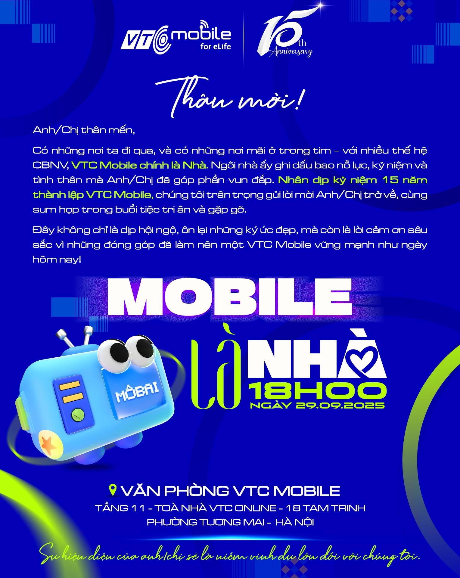 Với tất cả sự trân trọng và biết ơn, sắp tới đây, VTC Mobile tổ chức sự kiện “Mobile là Nhà” – một buổi gặp mặt ấm cúng và đầy cảm xúc dành riêng cho những "người cũ", như một lời mời gọi thân thương: “Hãy trở về nhà, nơi vẫn luôn giữ gìn những ký ức đẹp nhất về anh chị.”