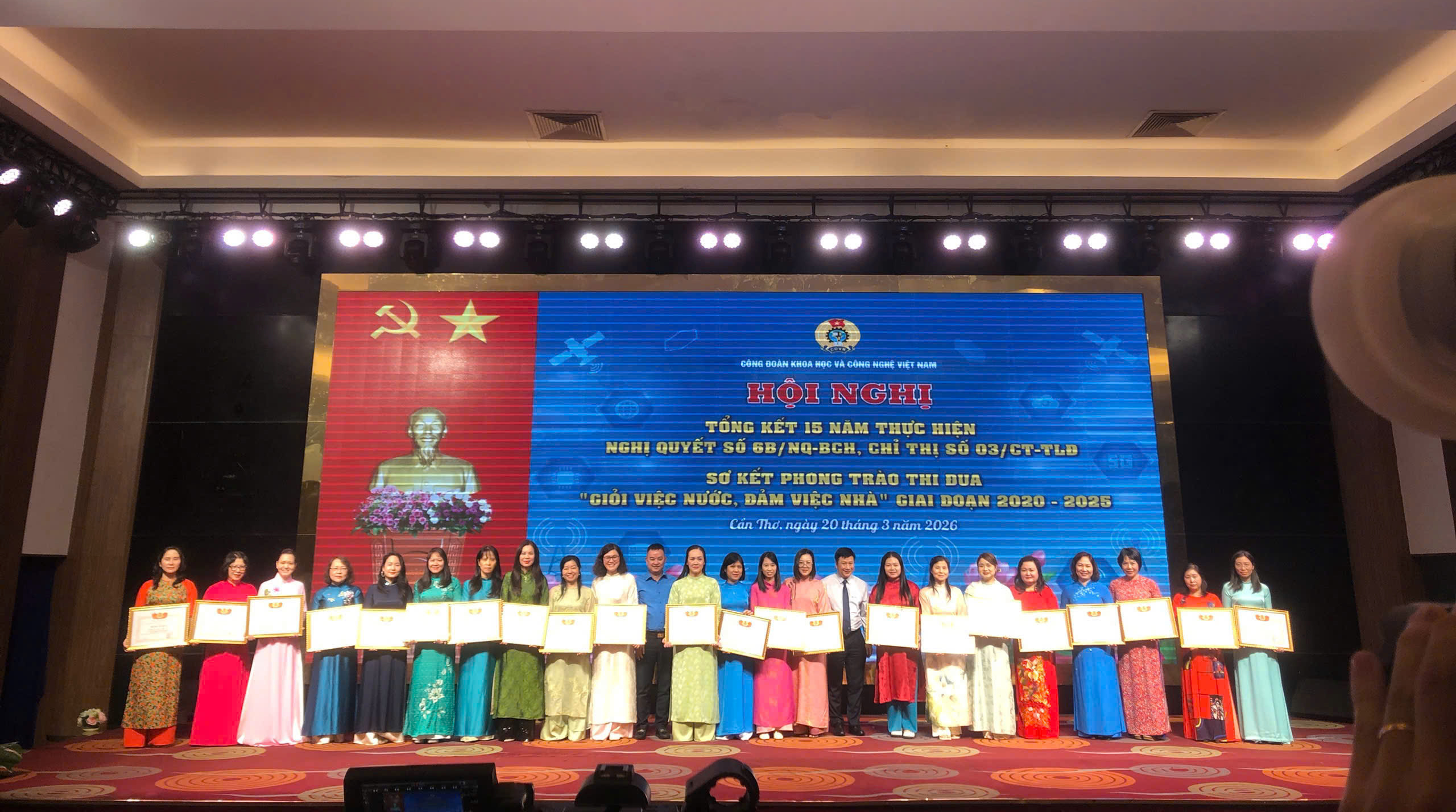 Sáng 20/5, tại TP. Cần Thơ, Công đoàn Khoa học và Công nghệ Việt Nam tổ chức Hội nghị tổng kết 15 năm thực hiện Nghị quyết số 6B của Ban Chấp hành Tổng Liên đoàn Lao động Việt Nam (khóa X) về công tác vận động nữ công nhân, viên chức, lao động (CNVCLĐ) trong thời kỳ công nghiệp hóa, hiện đại hóa đất nước; đồng thời sơ kết phong trào thi đua “Giỏi việc nước, đảm việc nhà” giai đoạn 2020–2025.