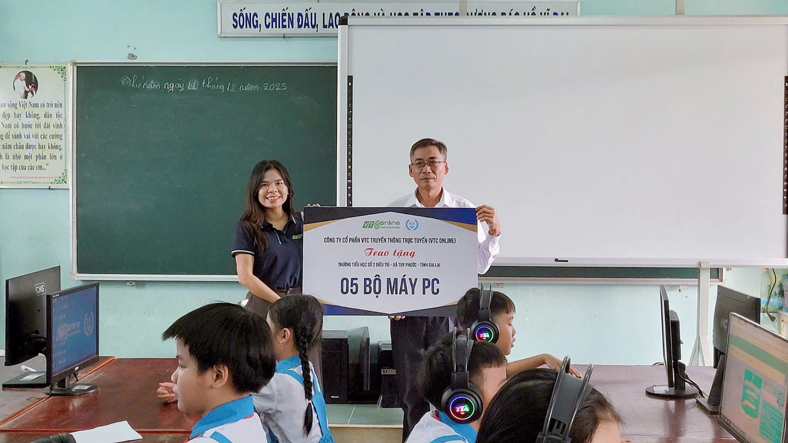 Đại diện Công ty VTC Online trao tặng 5 bộ máy vi tính cho Trường Tiểu học số 2 Diêu Trì (Gia Lai)