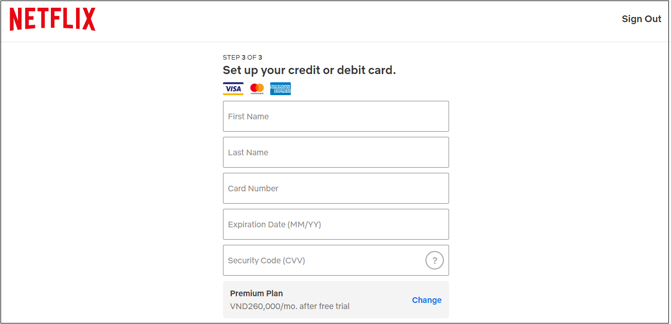 Ở Việt Nam, Netflix có hỗ trợ thanh toán qua thẻ Mastercard, Visa hoặc American Express. Tại đây chọn Mastercard và điền thông tin thẻ Mastercard ảo bạn đã mở bên trên.