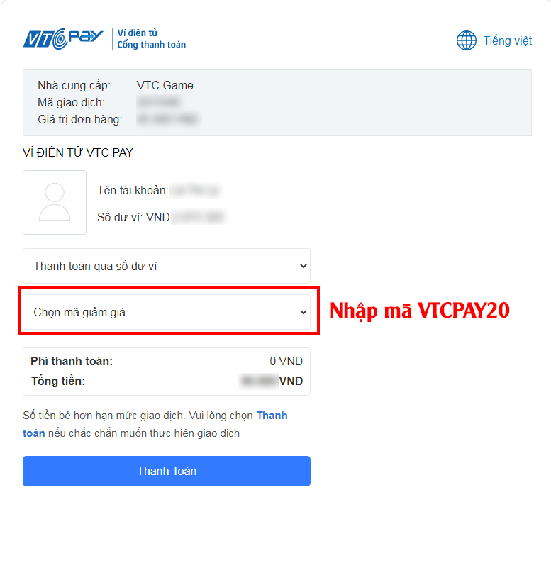 Giảm giá 5% - không giới hạn giá trị giao dịch tại kênh vtcgame.vn/. Áp dụng khi thanh toán qua Ngân hàng (Chuyển khoản, Thẻ ATM, Thẻ Visa, Paypal) và ví VTC Pay