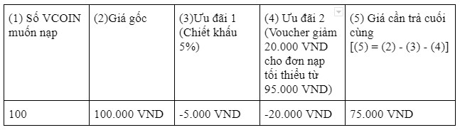 Chỉ cần nhập số lượng Vcoin bạn muốn nạp, hệ thống sẽ tính ngay số tiền, đã áp sẵn ưu đãi GIẢM GIÁ 5% nhé!