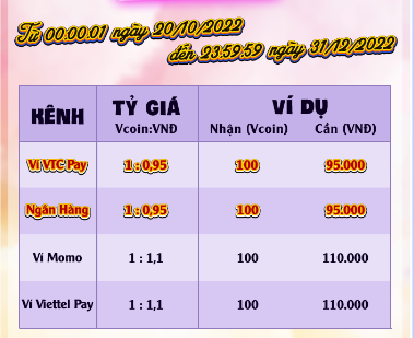 Từ ngày 20/10/2022, khách hàng lựa chọn nạp trực tiếp qua chuyển khoản ngân hàng hoặc thanh toán gói nạp game sẽ nhận ngay ưu đãi sốc chưa từng có.